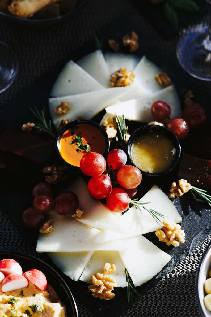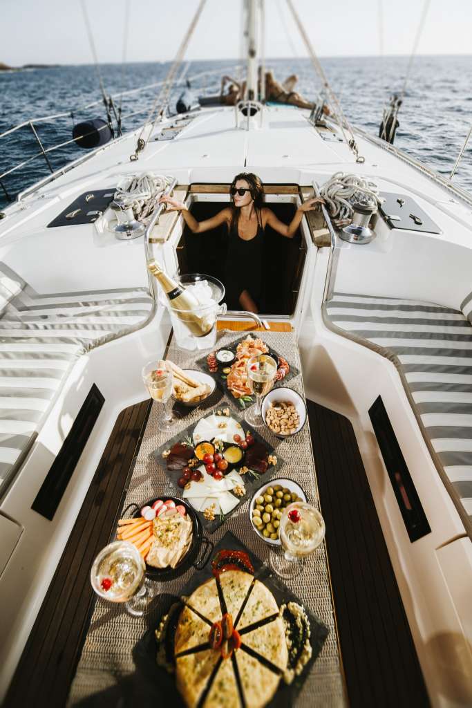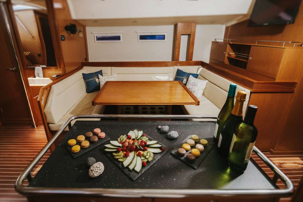 - High-quality onboard catering including cold cuts, cheese selection, Spanish omelette, hummus with crudités, nachos with guacamole, assorted snacks, fresh fruit platter, and macarons